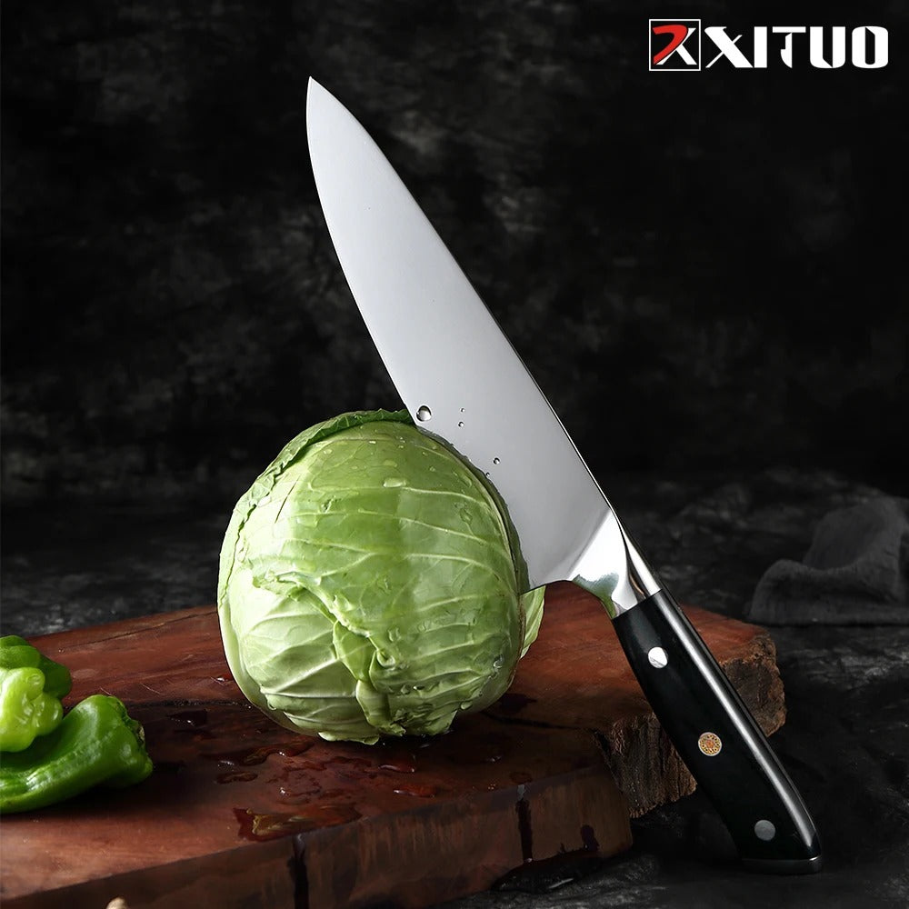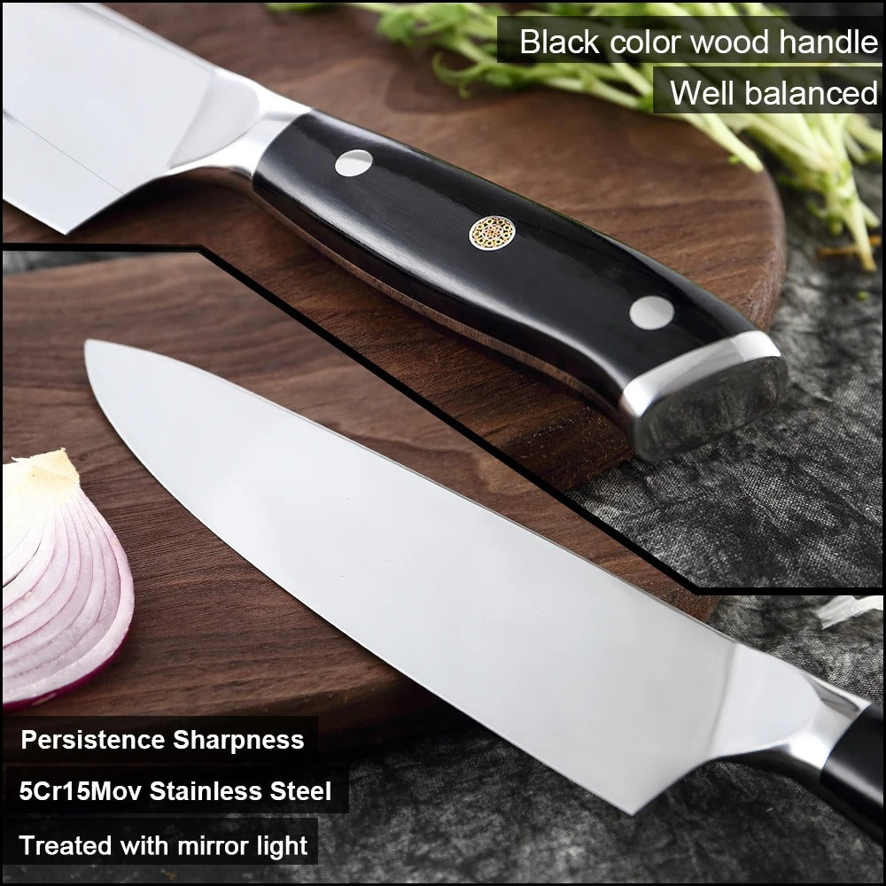 Crafted from German high carbon stainless steel. this 8-inch chef knife is a must-have for any kitchen. Its superior sharpness and precision make slicing. dicing. and chopping a breeze. The ergonomic handle provides a comfortable grip. while the santoku style blade effortlessly cuts through various ingredients. Upgrade your cooking game with this versatile and durable cleaver knife.